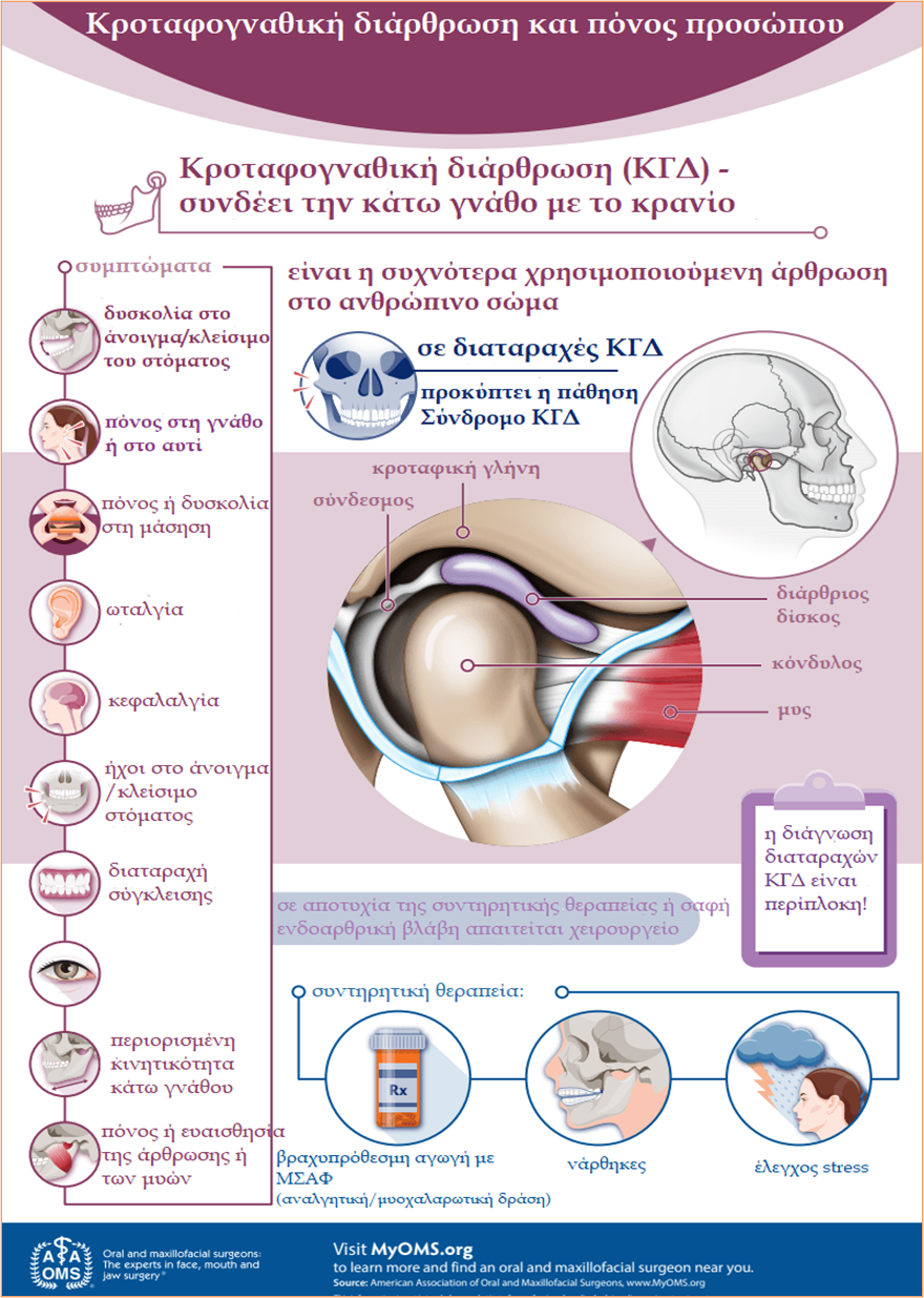 Η κροταφογναθική διάρθρωση (ΚΓΔ) συνδέει αμφοτερόπλευρα την αρθρική επιφάνεια της κάτω γνάθου, που λέγεται κόνδυλος, με την αρθρική επιφάνεια του κροταφικού οστού, που λέγεται κροταφική γλήνη, επιτρέποντας την κινητικότητα της κάτω γνάθου κατά τα 3 επίπεδα του χώρου. Σε περίπτωση δυσλειτουργίας της μίας ή και των δύο ΚΓΔ ο ασθενής παρουσιάζει συμπτώματα όπως πόνο, δυσκολία στη μάσηση και άλλοτε άλλου βαθμού περιορισμό της κινητικότητας της κάτω γνάθου, που περιγράφονται συνοπτικά με τον όρο «Σύνδρομο ΚΓΔ».