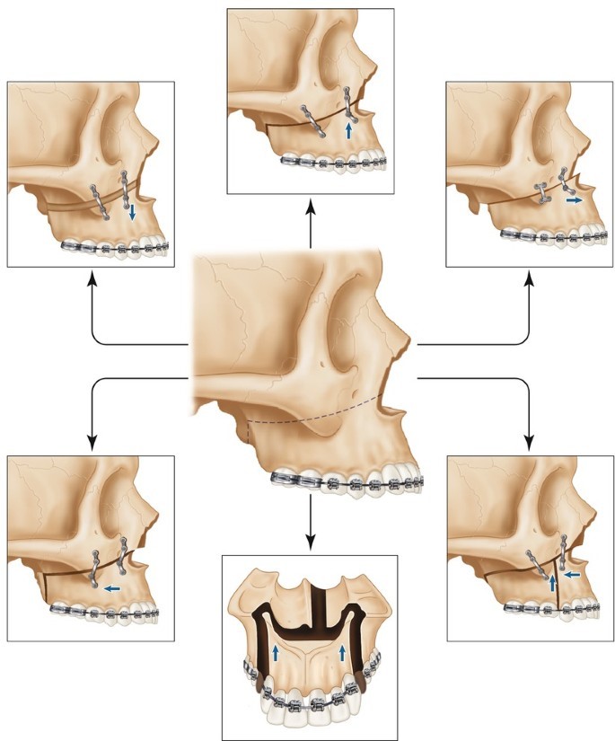Στην συνέχεια το συγκεκριμένο τμήμα της άνω γνάθου μπορεί να μετακινηθεί στην επιθυμητή θέση ως προς τις 3 διαστάσεις του χώρου, διατηρώντας την αιμάτωσή του από τα μαλακά μόρια. Ακολουθεί ακινητοποίηση με τη βοήθεια μικρών πλακών και βιδών τιτανίου, ώστε να εξασφαλισθεί η απαραίτητη σταθερότητα μετεγχειρητικά. (Εικόνα)