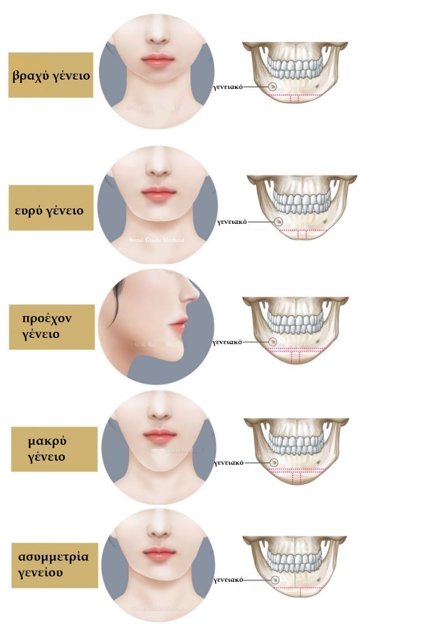 Σε περιπτώσεις οπισθογενειϊσμού (= μικρό, υπολειπόμενο γένειο) υπάρχει η δυνατότητα πρόσθιας μετακίνησής του μετά από οστεοτομία ή αύξησης του όγκου του με την τοποθέτηση αλλοπλαστικού υλικού, ανάλογα με τις υφιστάμενες ενδείξεις και αισθητικές απαιτήσεις.